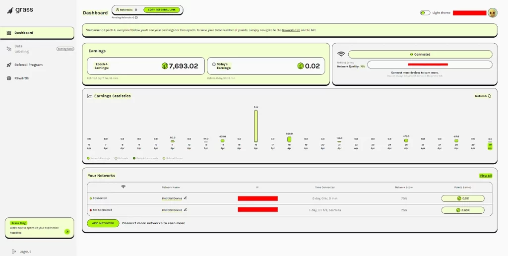 In addition to the Grass Points you earn directly, you can enhance your earnings by referring other users to Grass. Simply utilize your personalized referral code or link to enroll new users, and you’ll receive a perpetual 20% bonus based on all the Grass Points generated by their accounts. Your referral rewards persist as long as the user accounts you referred remain active on Grass. As their points accumulate, your bonus points also increase automatically. By consistently referring to even a small group of users, you can significantly boost your Grass Points earnings over time through this compounding effect.